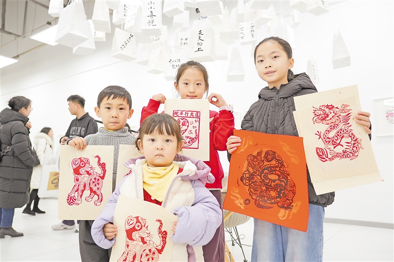 1月4日,小朋友展示自己心仪的版画作品。当天,由宁夏美术家协会、宁夏美术家协会版画艺术委员会主办的“灵蛇舞动·版画新春”2025蛇年生肖版画艺术展在贺兰县天青美术馆举办。本次展览邀请区内版画艺术家围绕蛇年生肖主题进行创作,展出作品60余件。本报记者 马赛尔 摄