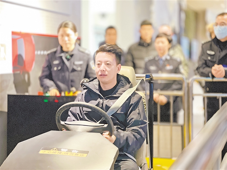 1月3日,行业代表在安全带碰撞区感受系好安全带的重要性。当天,银川市公安局交通警察分局机动车辆管理所举办警营开放活动,邀请驾校、服务站、检测线代表30余人,到银川车管所金凤业务大厅和银川市交通安全基地进行观摩,增进警民沟通,促进警民共建。 宁夏日报报业集团全媒体记者 李毓琛 摄