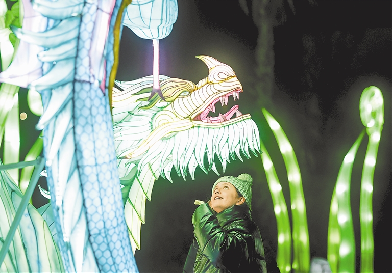 1月6日,在意大利罗马,观众欣赏中国龙造型灯饰。近日,一场“东方世界:中国花灯展”在意大利罗马举行。约1公里长的展览路线上布置了220个以中国龙宫和东方神话为主题的花灯,吸引市民游客前来观赏游玩。 新华社发