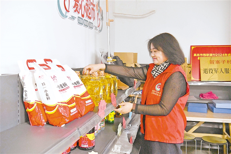 ④盐池县花马镇冒寨子村,志愿者在积分超市里码货。 (本版图片均 本报记者 白茹 摄)