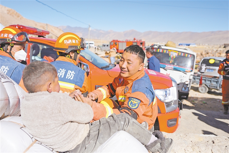 7日12时26分,在长所乡古荣村一座坍塌房屋的废墟下,发现一名被困人员,定日县消防救援大队与当地民警立即展开救援。救援人员以最快速度将土块铲出,将受困人员救出后转移至安全区域治疗。