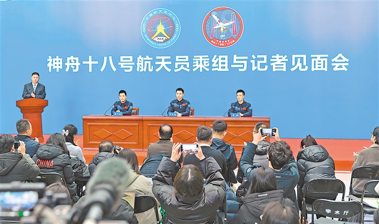 1月8日,中国航天员科研训练中心在北京航天城举行神舟十八号航天员乘组与记者见面会,叶光富(右二)、李聪(右一)、李广苏(右三)3名航天员从太空返回两个多月后首次正式公开亮相。新华社发