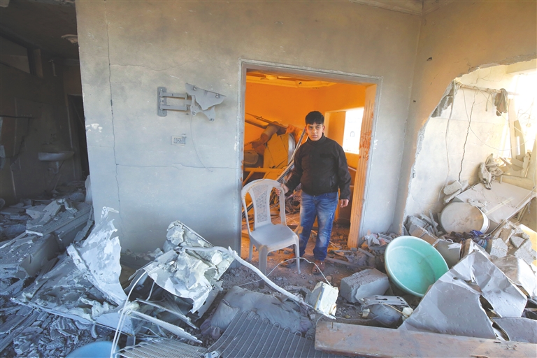 1月8日,在加沙地带中部城市代尔拜拉赫,一名巴勒斯坦男子在以军轰炸后的建筑内查看。巴勒斯坦加沙地带民防部门发言人马哈茂德·巴萨勒1月8日说,以色列军队当天空袭加沙地带多地,造成至少31人死亡。 新华社发