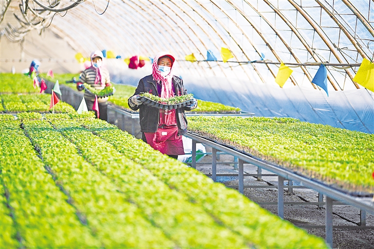 1月10日,位于贺兰县习岗镇的宁夏天缘种业有限公司育苗中心设施温棚内,一盘盘嫁接好的种苗依次铺开。据了解,宁夏天缘种业经过多年经营,实现了从品种引选、新品种推广、种苗繁育到冷链配送、品牌运营的全产业链融合发展,全年育苗量达6000余万株,带动1000余户农民通过“博柿后”小番茄增收致富。 本报记者 马楠 王洋 摄