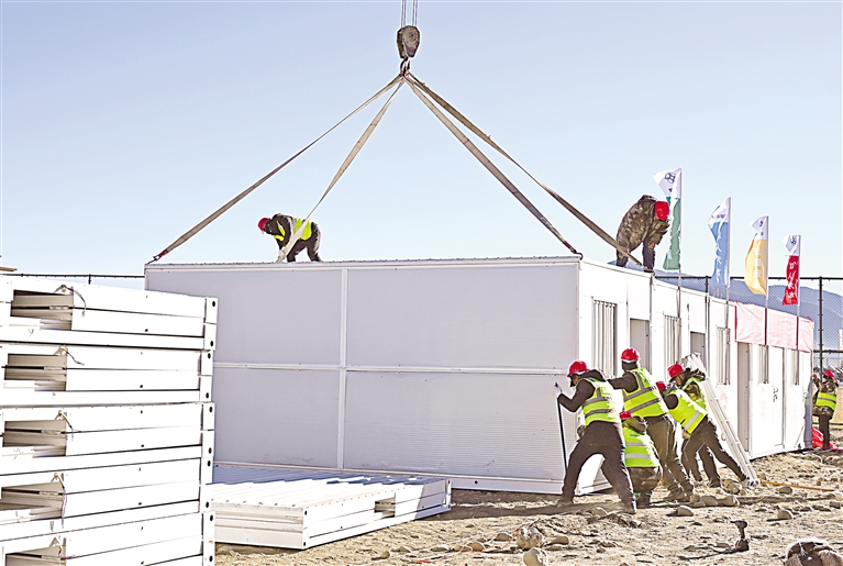 1月10日,工人在施工现场搭建活动房屋。新华社发