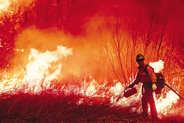 1月9日,一名消防员在美国洛杉矶地区参与扑灭山火。