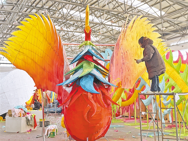 走进灯展布置现场,金蛇、龙、熊猫等造型的花灯惟妙惟肖。工人站在铁架上,为高大的彩凤花灯“穿”上华丽外衣、各种造型的小兔子花灯已经完工。