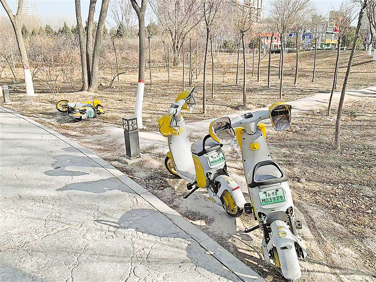 日前,记者在银川市兴庆区海宝公园看到,几辆共享单车被随意丢弃在公园的绿化带里。共享单车应该停放在指定的位置上,如此乱停乱放不仅给车辆运维带来困难,也有损城市形象。 本报记者 张涛 摄