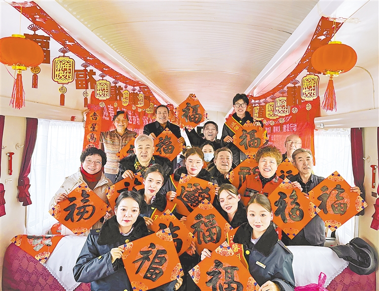 1月14日,由中国铁路兰州局银川地区铁路关工委、宁夏书画艺术发展促进会和宁夏塞外书画艺术研究会联合举办的“迎春纳福送春联 情暖旅途传爱心”活动在银川火车站举行。宁夏塞外书画艺术研究会组织10名志愿者书法家在候车大厅和1331次列车上,为旅客和铁路职工写春联、送祝福。 本报记者 周昕 摄