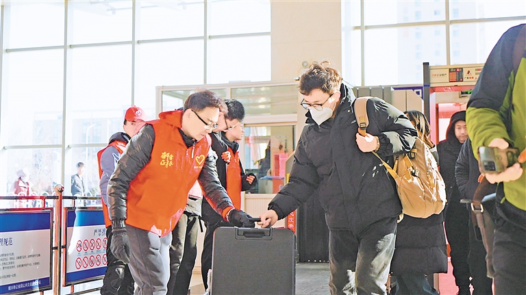 青年志愿者帮助乘客提行李。 本报记者 赵磊 摄