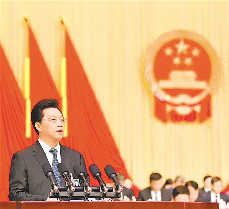 1月19日,宁夏回族自治区第十三届人民代表大会第三次会议在银川开幕。自治区人民政府主席张雨浦作政府工作报告。  本报记者 王鼎 摄