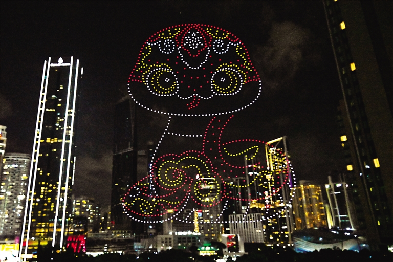 1月25日,在马来西亚吉隆坡举行的2025年“欢乐春节”全球启动仪式前,无人机展示蛇年主题图案。
