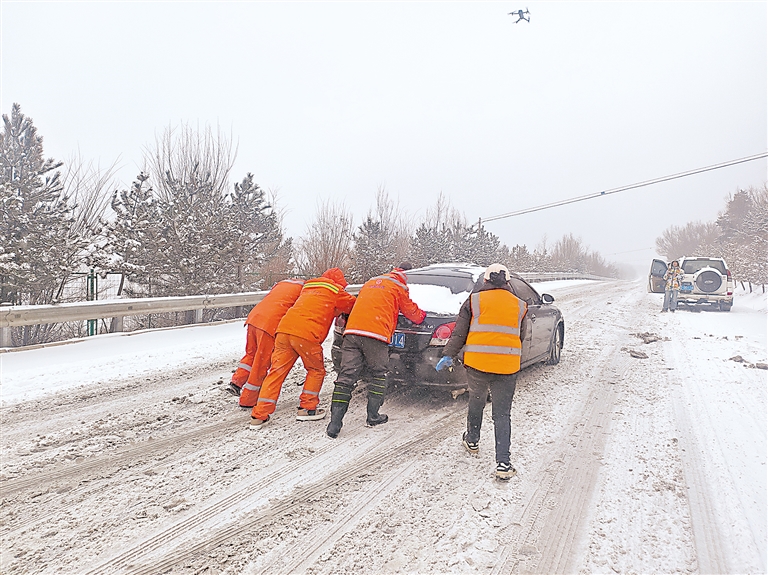 工作人员帮助受困司机。 本报记者 赵磊 实习生 何硕 摄