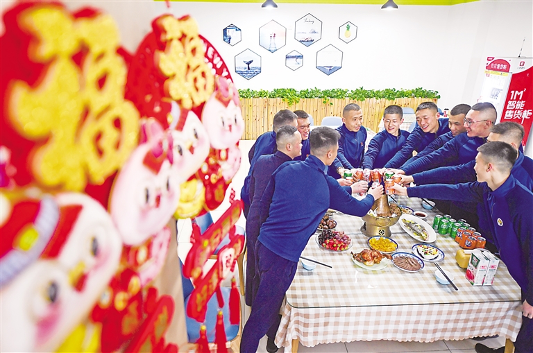 1月28日,银川市消防救援支队永宁大队望远消防救援站,消防员在一起吃团圆饭。 本报记者 马楠 摄