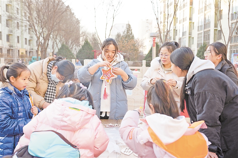 近日,银川市金凤区长城中路街道五里水乡社区联合银川隆光物业服务有限公司开展了“金蛇纳新喜迎春 年味市集暖人心”社区年货市集活动。居民们在家门口参与写春联、做手工灯笼等活动。 本报记者 马赛尔 王娜 摄