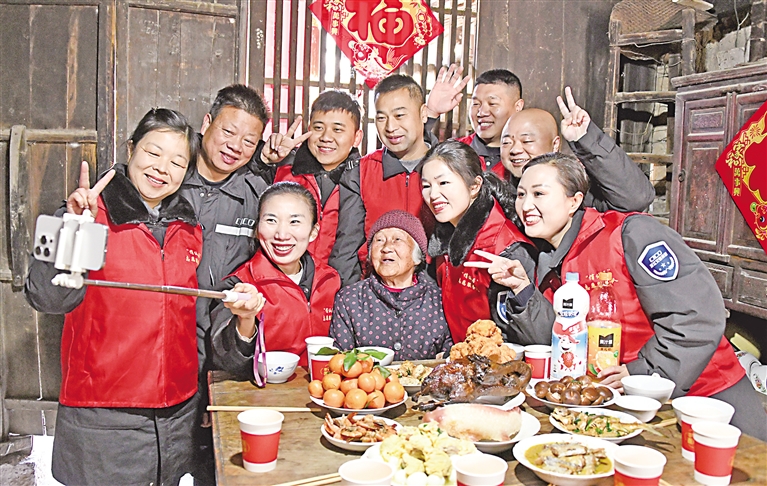 1月28日,志愿者在浙江省仙居县南峰街道下郭社区陪95岁独居老人吃“团圆饭”并合影。他们还帮老人打扫卫生、挂灯笼、贴春联,让老人开心过大年。除夕辞旧岁,人们与亲朋好友共吃团圆饭,互致美好祝福,在温暖祥和的氛围中喜迎新春佳节。均新华社发