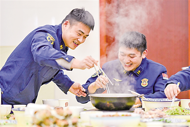 1月28日,在江苏省泰州市海陵区迎春西路消防救援站,消防员们一起吃团圆饭。