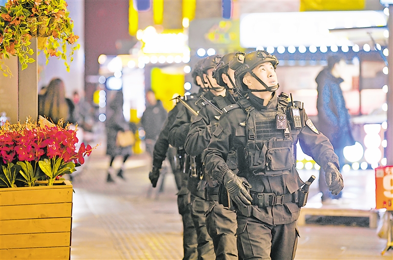 1月28日19时许,银川特警在阅彩城商圈巡逻。本报记者 马楠 王洋 摄