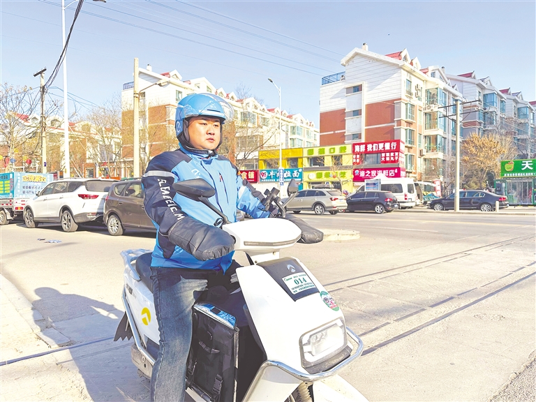 ①外卖骑手杨文源。本报记者 王雨婷 摄