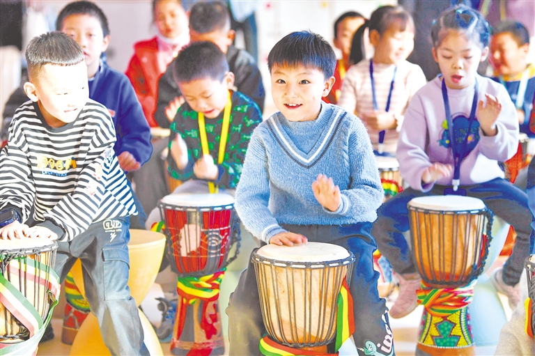 ③银川市金凤区长城中路街道工会在七子连湖社区职工之家开办寒假公益托管班。图为孩子们在学习非洲鼓。 本报记者 马楠 王洋 摄
