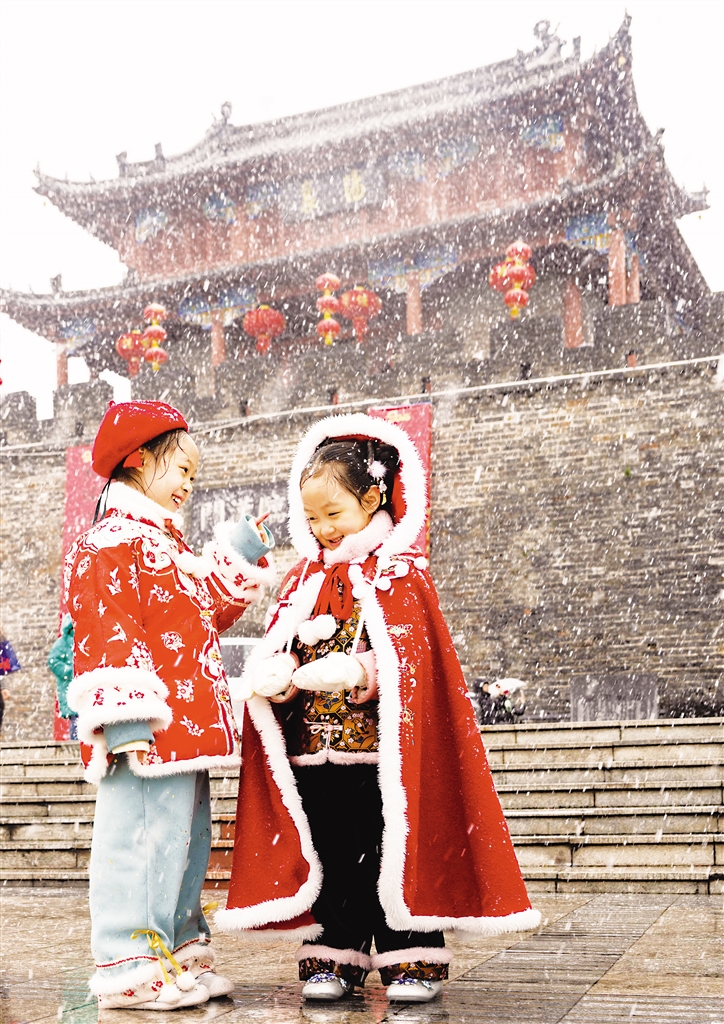 2月1日,两名小朋友在湖北襄阳古城冒雪游览玩耍。春节假期,各地举行多彩活动,欢度蛇年新春。 新华社发