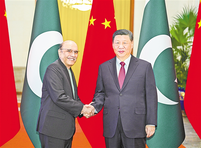 扎尔达里表示,巴基斯坦和中国是亲密邻邦,更是全天候的好朋友、好伙伴。巴中友谊历经风雨,两国人民的心始终紧紧相连。无论形势如何变化,巴方都将毫不动摇同中方站在一起。巴方感谢中方为巴经济社会发展提供无私帮助,愿学习中国成功经验,推动中巴经济走廊和各领域合作高质量发展,助力巴基斯坦实现工业化和现代化。在习近平主席英明指引下,中国在国际事务中发挥越来越大的引领作用,日益成为维护世界和平、稳定、繁荣的重要力量。巴方愿同中方密切配合,坚持多边主义,维护自由贸易,促进两国和广大发展中国家的共同利益。