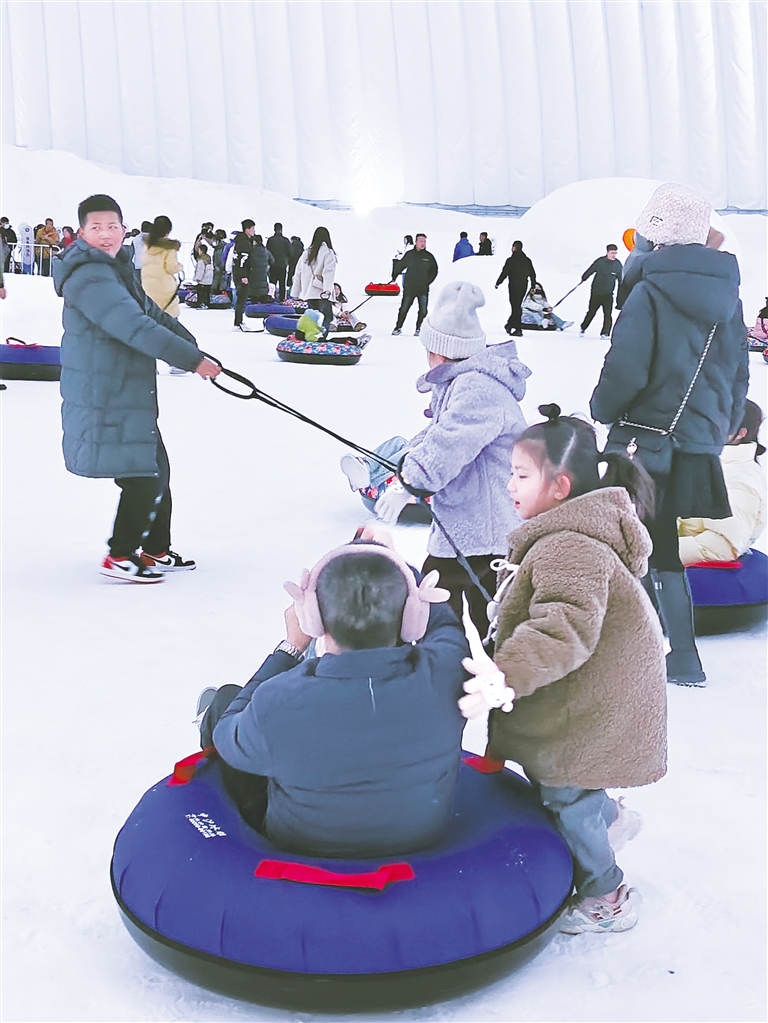 游客在沙坡头沙漠星空冰雪乐园体验雪圈项目。