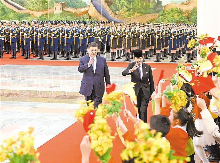 习近平指出,中文传统友谊源远流长。建交30多年来,双方不断深化政治互信,积极对接发展战略,各领域务实合作取得丰硕成果,在国际和地区事务中保持良好配合,树立了大小国家平等相待、互利共赢的典范,也为地区和平稳定和发展繁荣作出了积极贡献。中国和文莱共建命运共同体,顺应时代发展大势,符合两国和两国人民根本利益,开启了两国关系崭新篇章。双方要乘势而上,深化互利合作和战略协同,彼此尊重、坦诚互信,永远做隔海相望的好邻居、相互信赖的好朋友、共同发展的好伙伴。