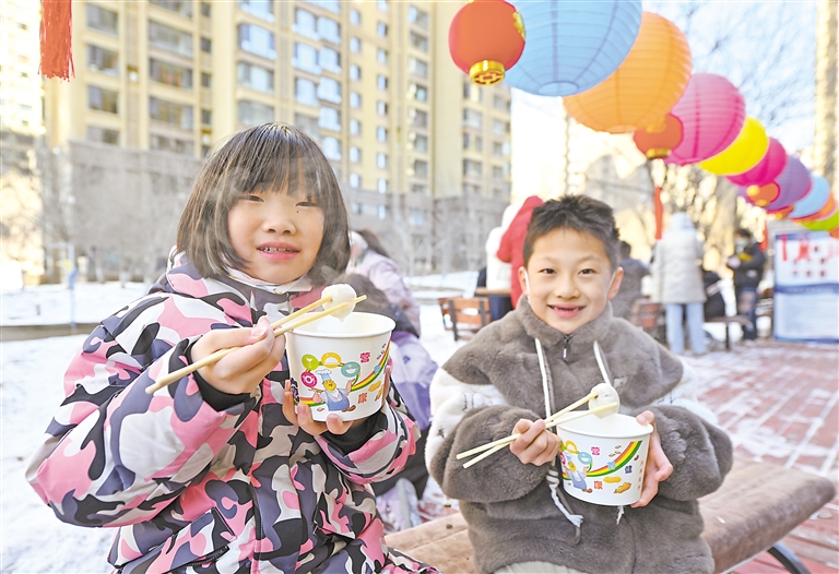 2月7日,孩子们在品尝汤圆。当天,银川市金凤区长城中路街道宝湖社区开展“民族团结一家亲·邻里守望闹元宵”活动,吸引了近百位辖区居民参与,大家在欢乐的气氛中一起看社火、扭秧歌、猜灯谜、品汤圆,喜迎元宵佳节的到来。 本报记者 左鸣远 摄
