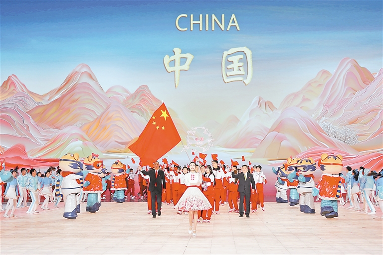 2月7日,中国体育代表团在开幕式上入场。当日,第九届亚洲冬季运动会开幕式在哈尔滨举行。 新华社发