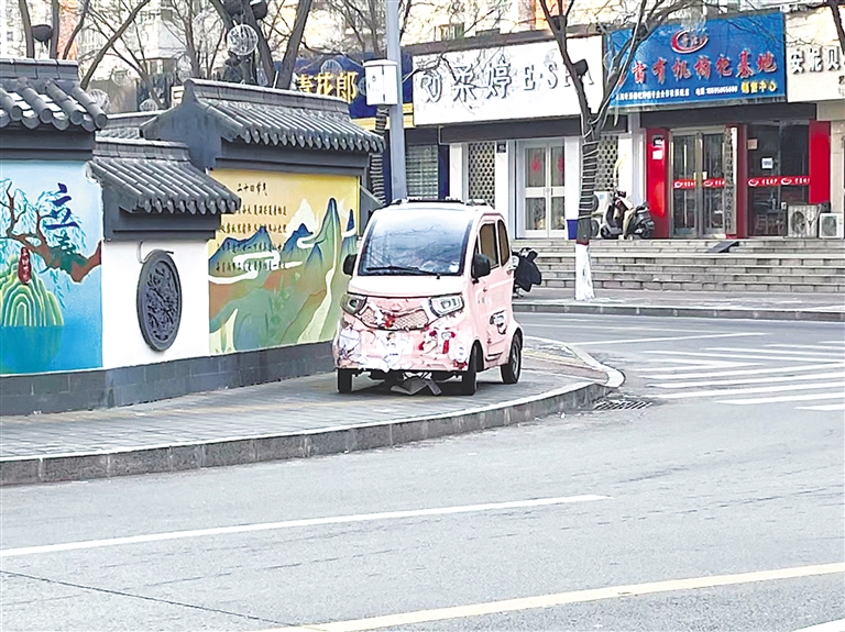 日前,在银川市金凤区宁安东巷与雪绒巷交叉路口,一辆老年代步车随意停靠,挡在人行道出入口处,影响来往群众通行。 本报记者 陶涛 摄