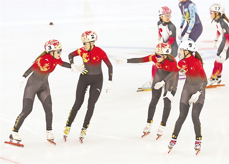 2月9日,中国队选手庆祝夺冠。 当日,第九届亚冬会短道速滑女子3000米接力A组决赛在哈尔滨举行,中国队夺得冠军。