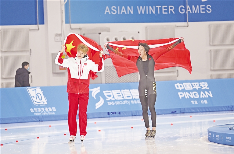 2月9日,吴宇(右)和刘瀚彬在比赛后庆祝。 当日,在哈尔滨举行的第九届亚冬会速度滑冰男子5000米比赛中,中国选手吴宇、刘瀚彬、哈那哈提·木哈买提分别获得冠、亚、季军。 均新华社发