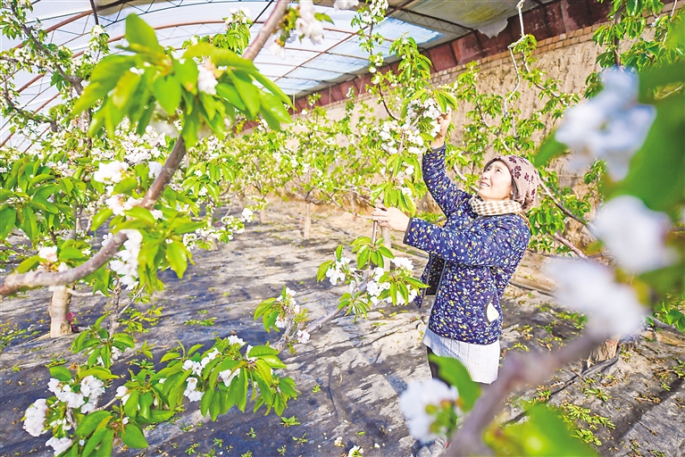 2月9日,贺兰县习岗镇新平园区峻松樱桃采摘园设施温棚内,季冬敏在打理自家的樱桃树。银川市自2015年开始栽培大樱桃,目前已形成了以贺兰县为主,西夏区、金凤区、永宁县城郊结合区域均有种植的格局。截至2024年底,银川市设施樱桃种植面积已超过1000亩,年产值约1.5亿元。本报记者 马楠 摄