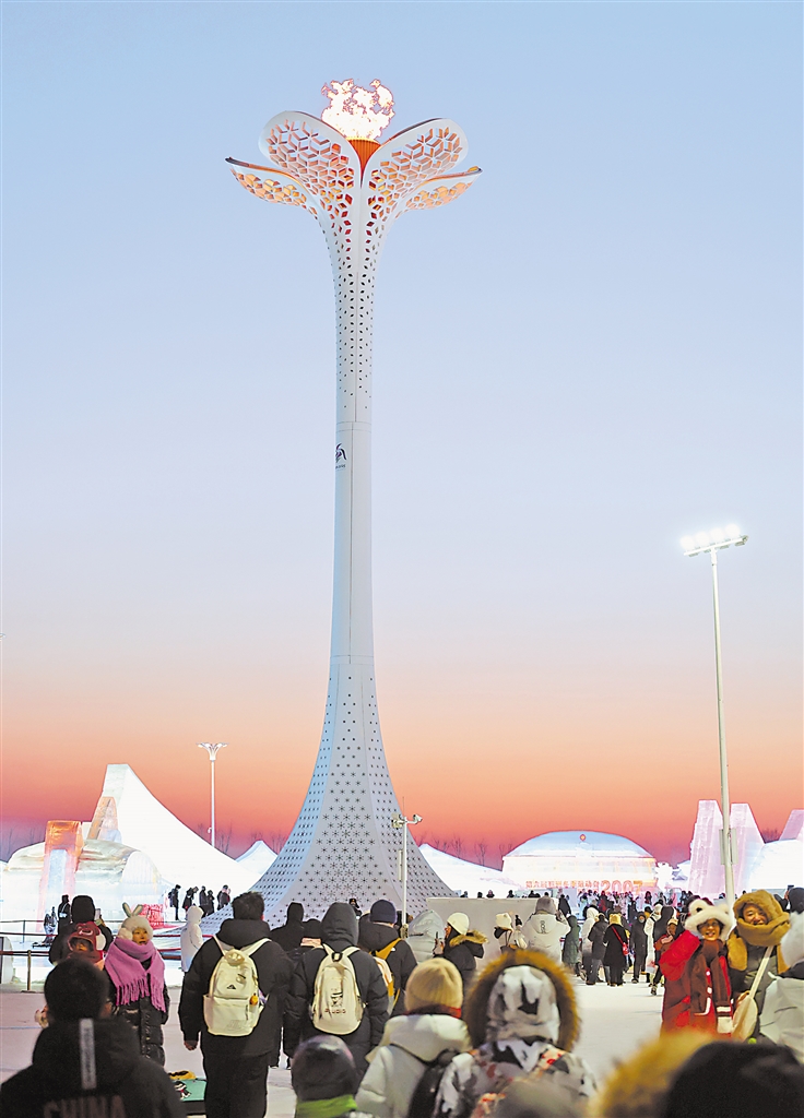 2月9日,游客在哈尔滨冰雪大世界亚冬会主火炬附近游览。