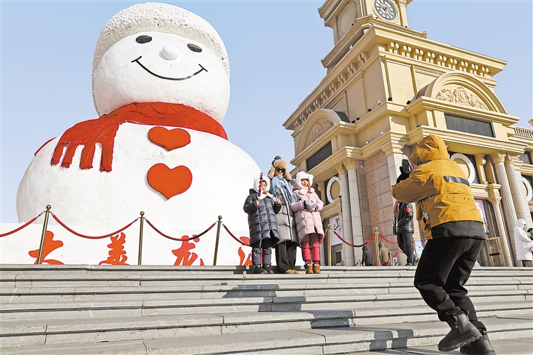 2月9日,来自浙江衢州的姜先生一家在哈尔滨群力音乐公园参观网红大雪人时拍照留念。 冰雪旅游热门目的地黑龙江哈尔滨在第九届亚冬会的带动效应下,吸引了众多国内外游客前来赏冰乐雪,感受冰雪之美。均新华社发