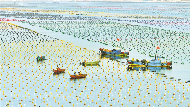 2月11日,在山东省荣成市爱伦湾海洋牧场海带养殖区,养殖工人在加装海带浮筏(无人机照片)。山东省荣成市是我国重要的海带养殖区,年产鲜海带50万吨以上,被誉为“中国海带之乡”。 新华社发