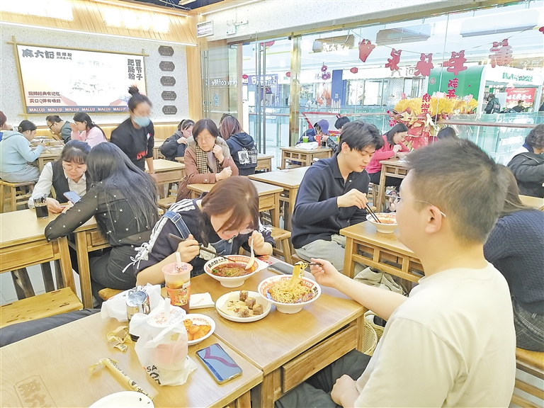 云南菜、川渝味、贵州酸汤、韩式烤肉……漫步商圈,特色风味吸引了不少食客进店品尝。为了增强消费者的体验感与专属感,金凤万达广场2024年引进10余家首店,涵盖餐饮、服装、美妆等品牌。“锅底清爽,牛肉滑嫩,涮菜荤素搭配可口,第一次吃感觉不错,下次还会再来。”在金凤万达广场黄牛寨渣渣牛肉店,市民马枫对自己的黔味午餐很满意。店门口招牌上,“人在银川 食在贵州”的字样吸引着尝鲜的顾客。“这个店2024年11月底开业,市场反馈很不错。”该店负责人欧剑波说。