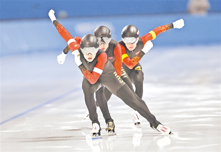 2月11日,中国队选手刘瀚彬、吴宇、哈那哈提·木哈买提(从前到后)在比赛中。当日,第九届亚冬会速度滑冰男子团体追逐决赛在哈尔滨举行。中国队夺得冠军。新华社发