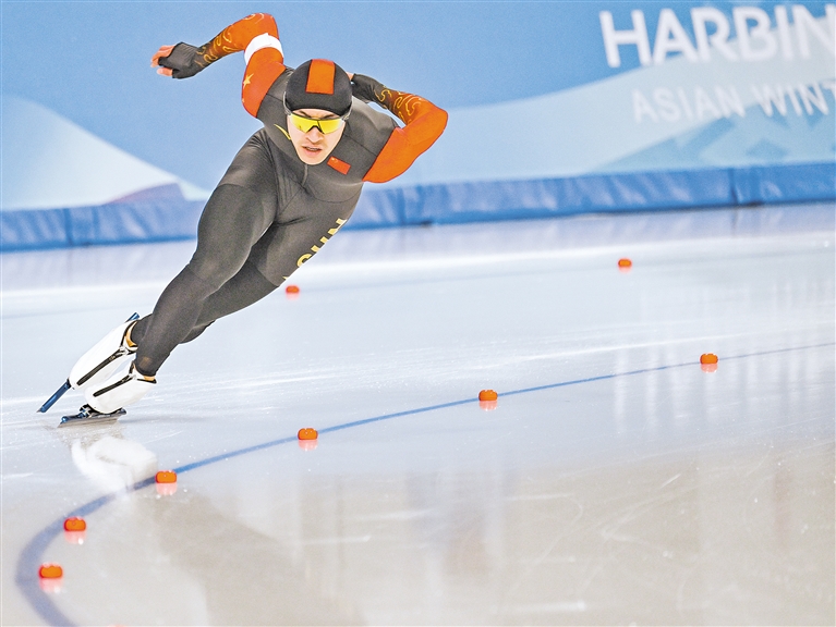 2月11日,中国选手宁忠岩在比赛中。当日,在第九届亚冬会速度滑冰男子1000米比赛中,中国选手宁忠岩夺得冠军,韩国选手车旼奎获得亚军,中国选手廉子文获得季军。新华社发
