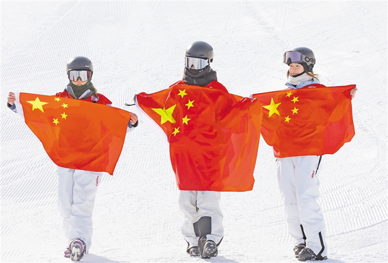 2月11日,刘梦婷(中)、杨如意(右)、韩林杉在赛后庆祝。当日,第九届亚冬会自由式滑雪女子坡面障碍技巧决赛在亚布力举行。中国选手刘梦婷获得冠军,杨如意获得亚军,韩林杉获得季军。新华社发