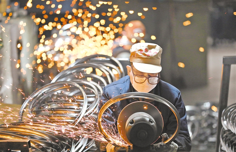 2月11日,在浙江省杭州市临安区天目山镇一家外贸企业,工人在对准备销往海外的自行车钢圈进行抛光作业。新春伊始,各地企业开足马力赶订单、忙生产,力争“开门红”。