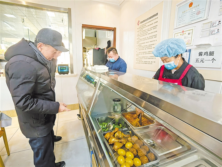 当日11时许,记者在社区食堂看到,大厨正在后厨颠勺炒菜,热火朝天,另一边工作人员将炝拌小白菜、酱鸡腿、卤鸡蛋等菜品整整齐齐地摆放到保温柜里,并将免费的白菜豆腐汤倒进保温桶,摆放好干净的小碗、汤勺。家住银湖小区的74岁居民李慧民挑选了葱爆牛肉、土豆丝和炝拌小白菜,“我从吴忠市搬到银川市不到4个月,当时我买房子的要求就是附近要有社区食堂,儿子按要求走访了十几家社区食堂后挑了这个食堂,并在附近买了房子。”李慧民夸赞着,“这个食堂饭菜好吃,服务态度也好,干净卫生,物美价廉。”一旁正在打菜的职工李文颖也附和道:“初八上班,我还发愁餐厅都不开门,没地儿吃饭。没想到,社区食堂早早开门了,解决了我们的吃饭问题,太好了。”
