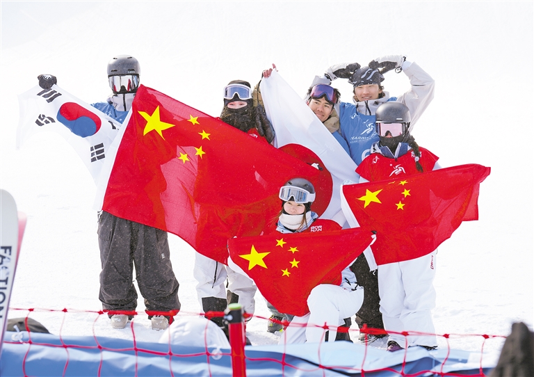 2月12日,刘梦婷(后左二)、韩林杉(前右)、杨如意(前左)与自由式滑雪男子大跳台冠军日本选手笠村雷(后右二)、亚军韩国选手尹宗铉(后左一)、季军韩国选手申英燮(后右一)在赛后合影。当日,在亚布力举行的第九届亚冬会自由式滑雪女子大跳台决赛中,中国选手刘梦婷、韩林杉、杨如意分别获得冠、亚、季军。 新华社发