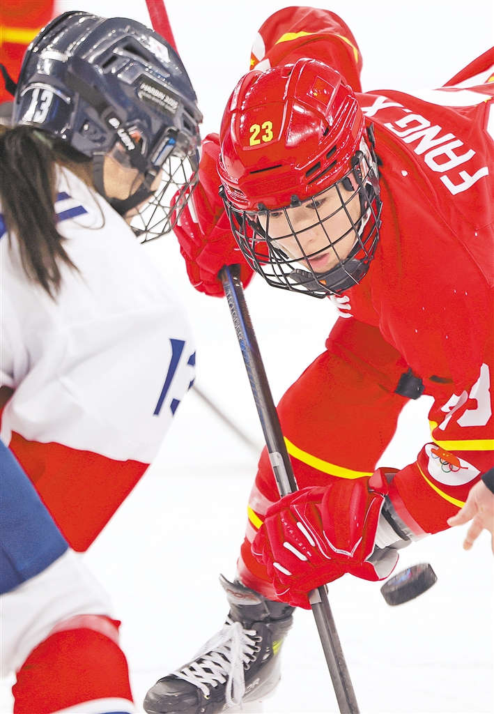 2月12日,中国队球员方新(右)在比赛中争球。当日,在哈尔滨举行的第九届亚冬会女子冰球小组赛A组比赛中,中国队2比1战胜韩国队。 新华社发