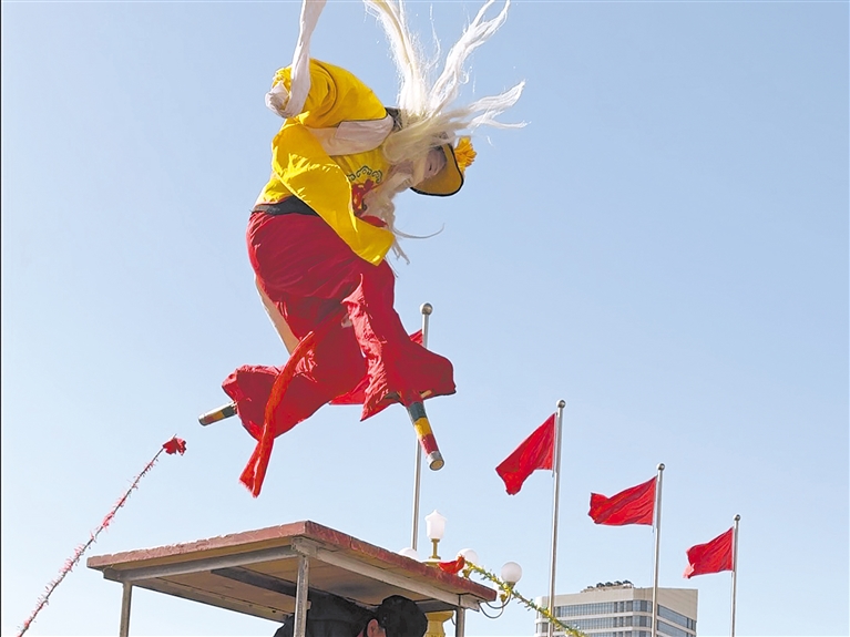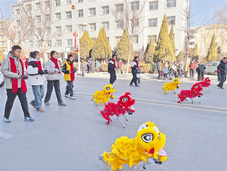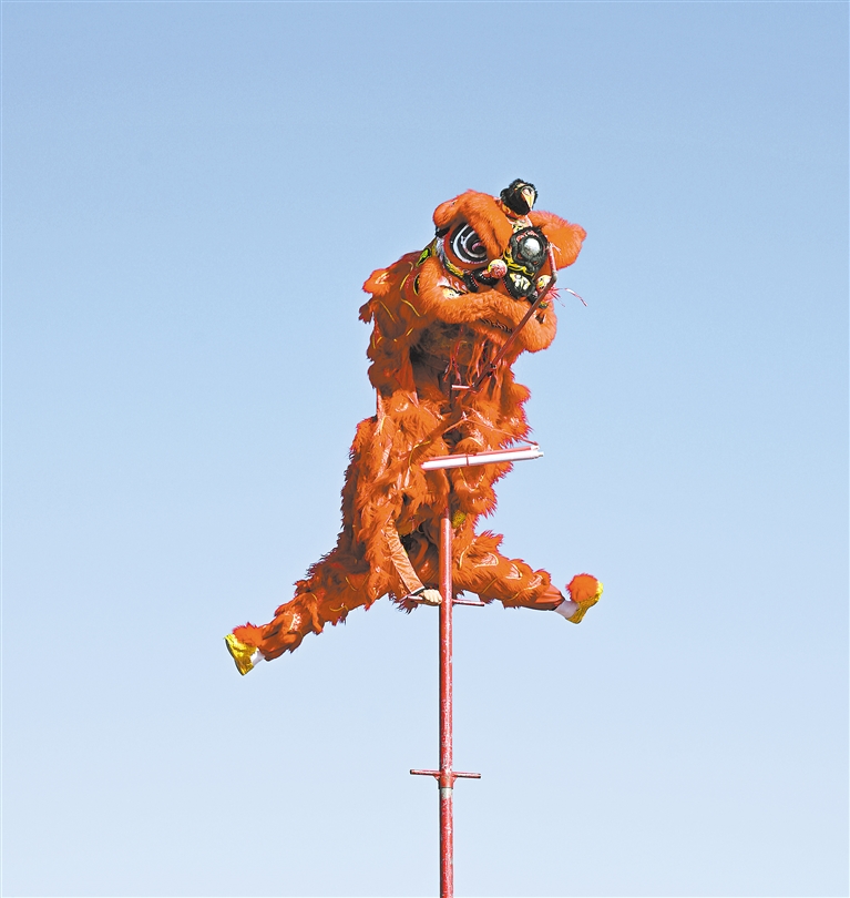 中卫市社火展演现场,表演者献上“雄狮登高”的绝活。 宁夏日报报业集团全媒体见习记者 王强 杨月儿 摄