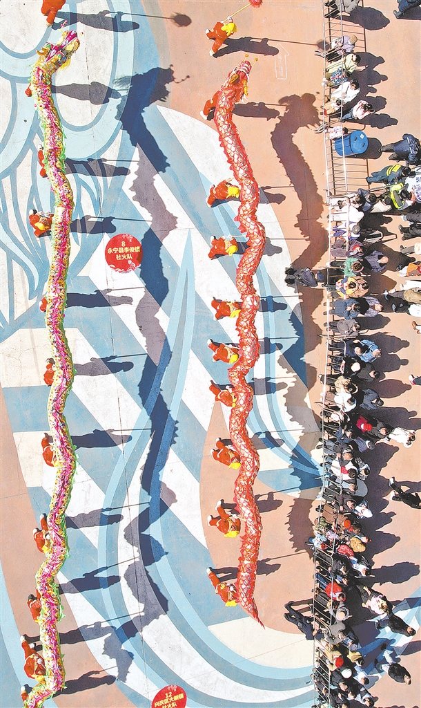 2025年银川市社火决赛暨巡游展演活动在位于银川的中国花卉博览园精彩上演,现场两条“巨龙”舞动生风。 本报记者 左鸣远 王晓龙 马楠 摄