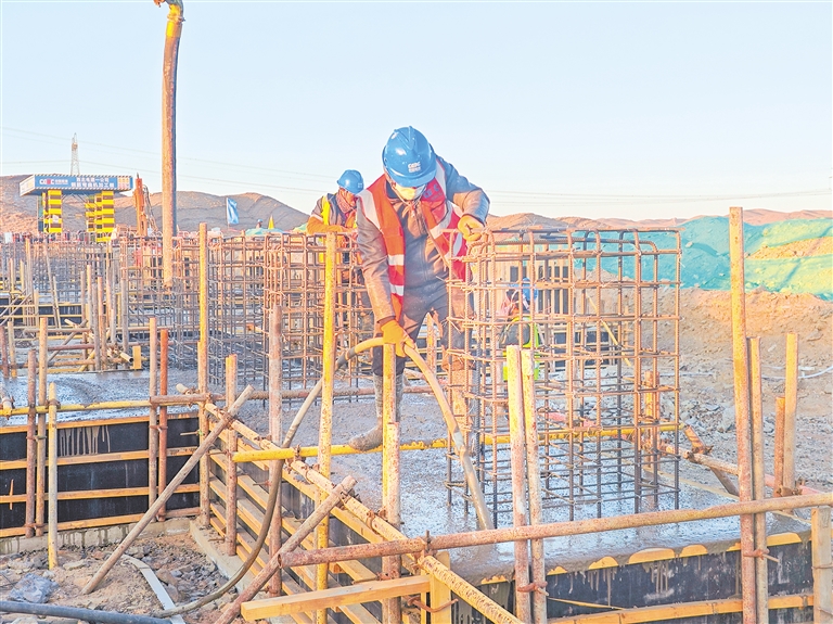 2月12日,在中卫市沙坡头区中能建沙坡头区麦垛山一期40万千瓦光伏项目建设现场,工人在钢筋绑扎。该项目可解决当地约800人就业,预计今年6月建成投用后,每年发电量达8.1亿度,相当于40万户家庭一年的用电量。