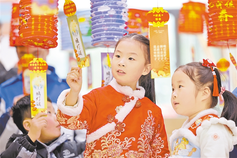2月12日,小朋友在山东省枣庄市市中区中心街街道大观园社区参加“猜灯谜 闹元宵”活动。当日是元宵节,各地举办多彩活动,欢欢喜喜闹元宵。新华社发
