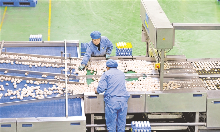 2月13日,固原市原州区中河乡兴百业高品蛋鸡产业园,工人们正忙着将经过清洗、烘干、消毒、称重、喷码等工序的鸡蛋分拣装箱、打包。目前,产业园一期工程18栋鸡舍的主体工程已全部完成,存栏鸡170万只,年产蛋2.6万吨,产值3.39亿元。 本报记者 王洋 贺紫瑞 摄